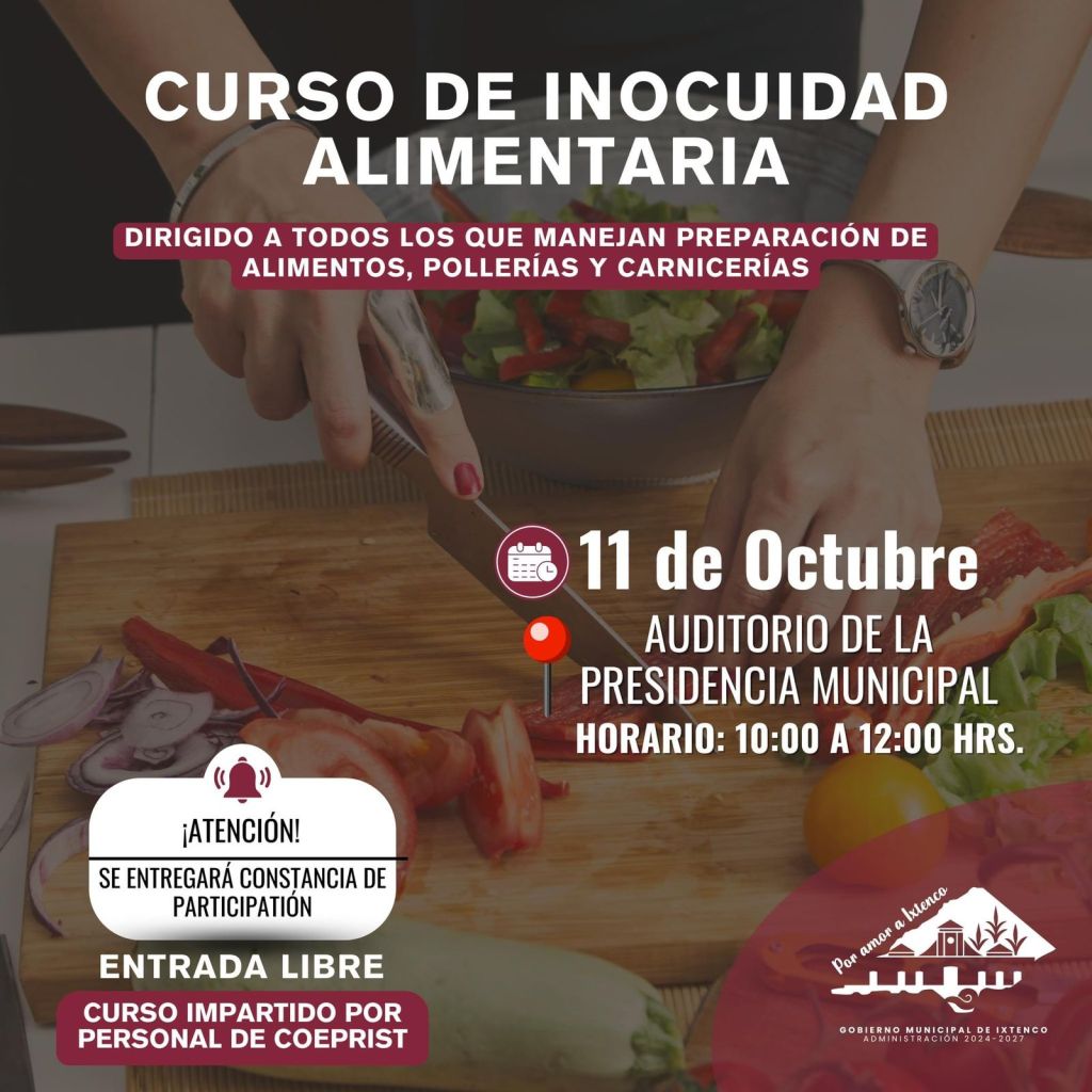 El Gobierno Municipal de Ixtenco, que encabeza Aline Lazo Caballero, en coordinación con la Comisión Estatal para la Protección contra Riesgos Sanitarios de Tlaxcala, llevarán a cabo la impartición de un curso de capacitación dirigido a las personas que vendan y/o preparen productos alimenticios.