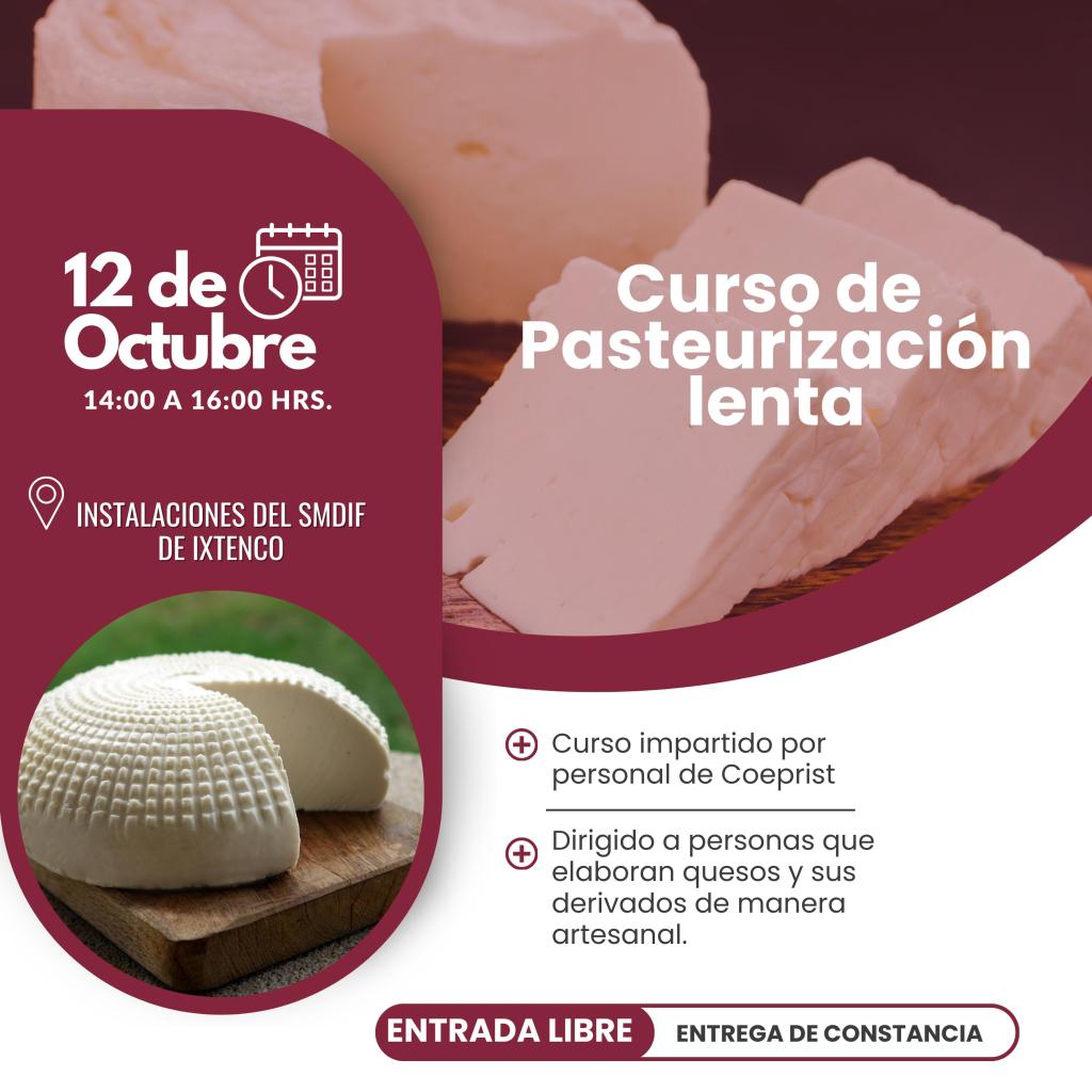 El Gobierno Municipal de Ixtenco, que encabeza Aline Lazo Caballero, en coordinación con la Comisión Estatal para la Protección contra Riesgos Sanitarios del Estado y protección civil municipal, convocan a los productores de quesos de la región a tomar un curso de capacitación sobre pasteurización lenta.