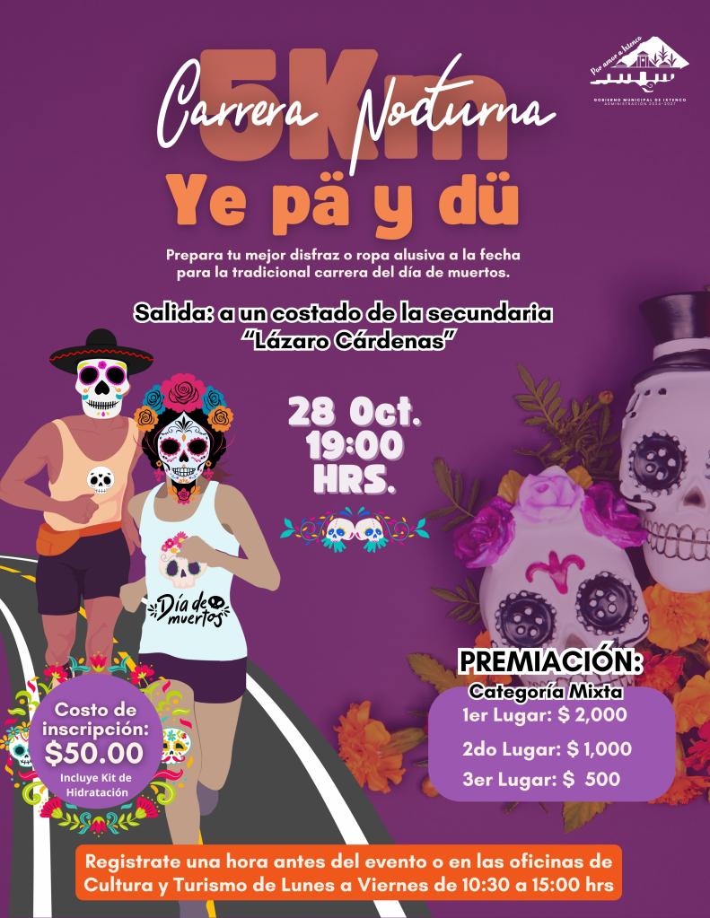 La Carrera “Ye Pä y dü”, se llevará a cabo el próximo 28 de octubre en punto de las 19:00 horas, la ruta de 5 kilómetros iniciará en la Unidad Deportiva Tlahuicole a la Ermita y de regreso y se premiará a una sola categoría mixta.