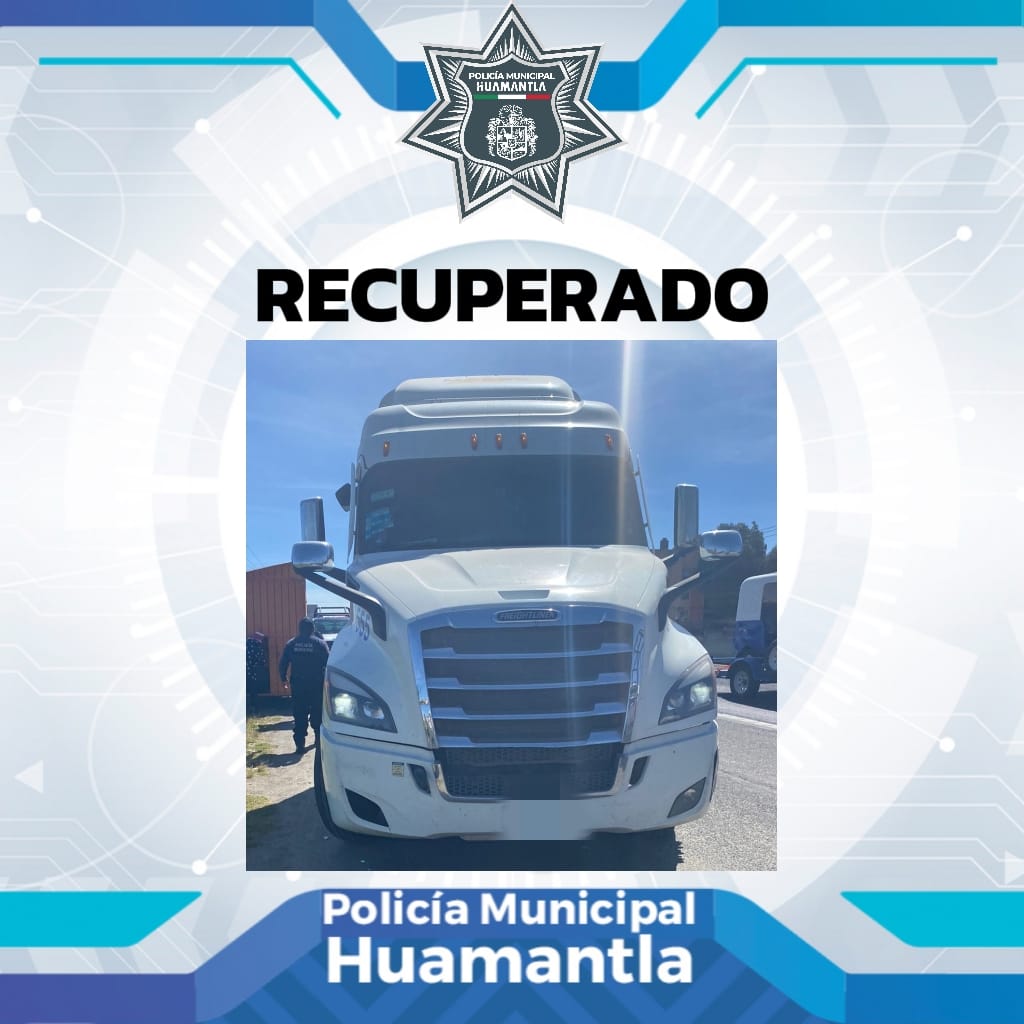 La Policía Municipal de Huamantla ubicó un tractocamión de la marca Freightliner, modelo 2022, color blanco, con placas de circulación 07AR4F, del Estado de México, que había sido reportado como robado ante el sistema de emergencia.