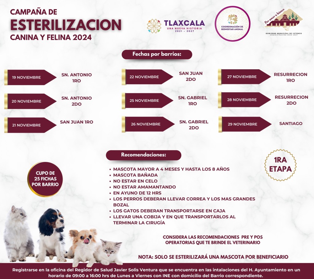 El Gobierno Municipal de Ixtenco, que encabeza Aline Lazo Caballero, a través del regidor de salud Javier Solís Ventura, y la Coordinación de Bienestar Animal del Gobierno del Estado, convocan a la campaña de esterilización de perros y gatos en nueve fechas diferentes, mismas que se llevarán a cabo en los barrios de la demarcación otomí.