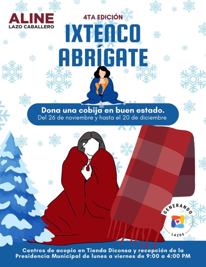 Aline Lazo Caballero, anunció la cuarta edición de la campaña “Ixtenco Abrígate”, que pretende entregar cobijas en esta temporada invernal, a las familias más vulnerables del municipio. Este año, las donaciones darán inicio a partir de este día y hasta el 20 de diciembre y se llevarán a cabo en coordinación con la agrupación de “Generando Lazos”.