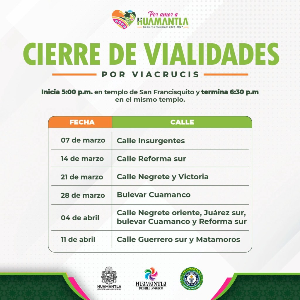 El Gobierno Municipal de Huamantla informa a la ciudadanía sobre el cierre temporal de vialidades debido al viacrucis que se llevará a cabo en el barrio de San Francisquito, el cual tendrá lugar este viernes a partir de las 5:00 pm. en el templo de este lugar y concluirá a las 6:00 pm.