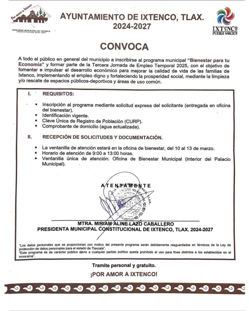 Con el firme compromiso de impulsar el empleo digno y fortalecer la recuperación de espacios públicos en la comunidad, el H. Ayuntamiento de Ixtenco, encabezado por la Presidenta Municipal Aline Lazo Caballero, hace una cordial invitación a la población para participar en la Tercera Jornada de Empleo Temporal 2025, en el marco del programa “Bienestar para tu Economía”.