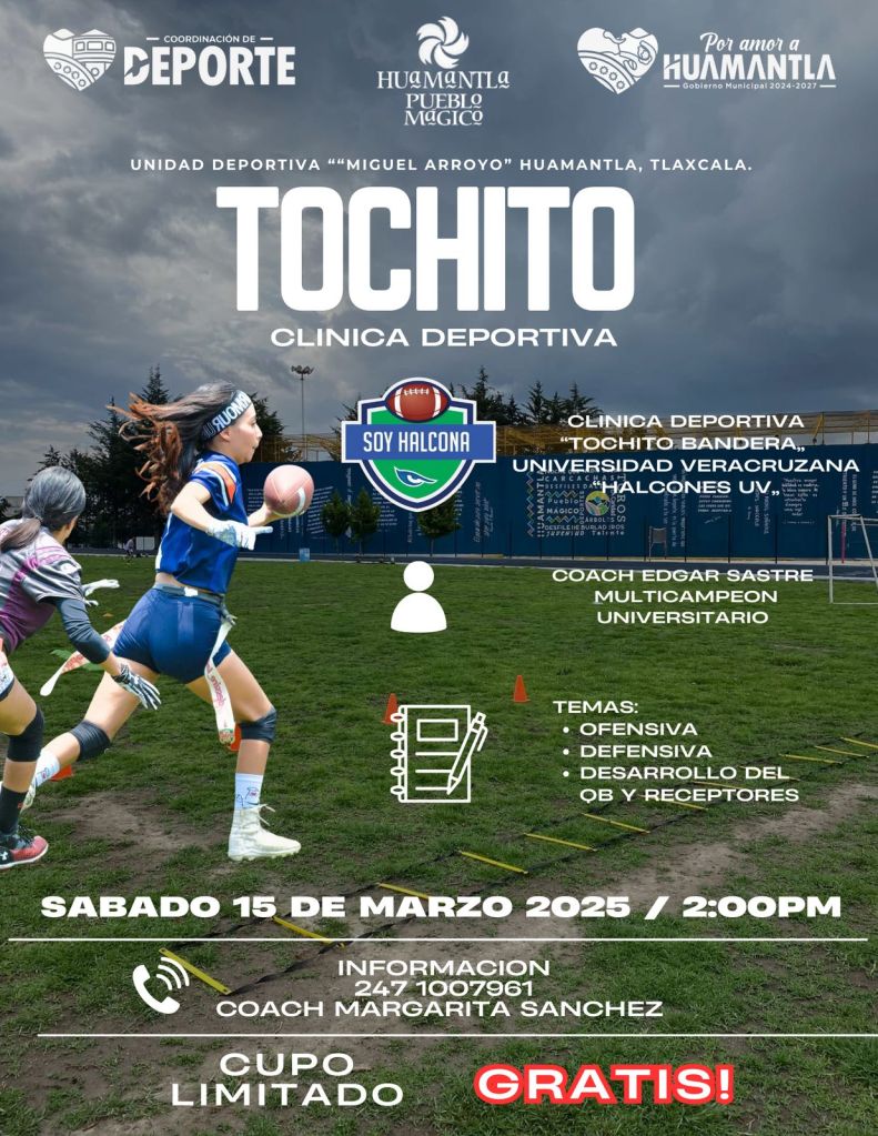 El Gobierno de Huamantla, a través de la Coordinación de Deporte, invita a toda la comunidad interesada a participar en la Clínica Deportiva «Tochito Bandera Universidad Veracruzana Halcones UV», la cual se llevará a cabo este sábado 15 de marzo a las 14:00 horas, en la Unidad Deportiva “Miguel Arroyo Rosales”.