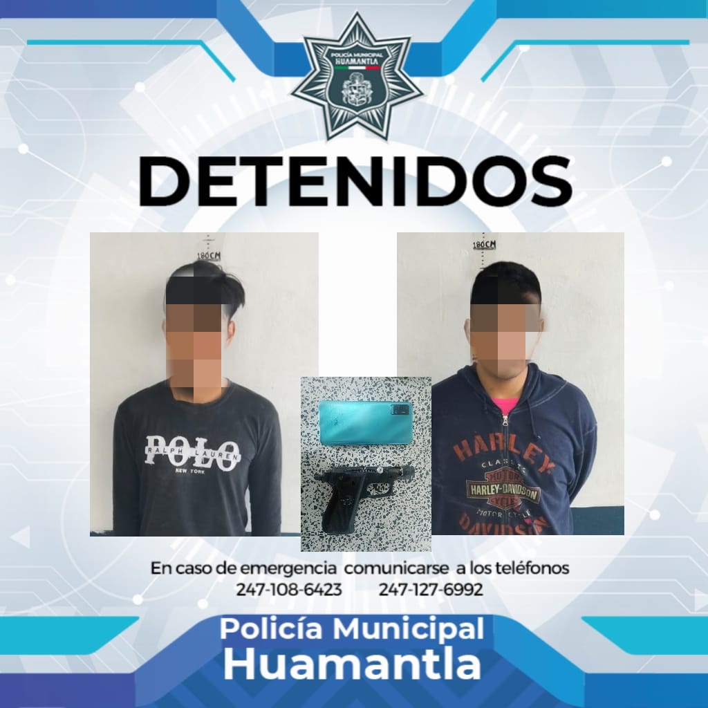 Mediante un exitoso operativo, elementos de la Policía Municipal de Huamantla lograron la captura de dos hombres acusados de robo a transeúntes, a quienes les fueron asegurados un artefacto con características de arma de fuego, dos teléfonos celulares y la cartera de una persona afectada.