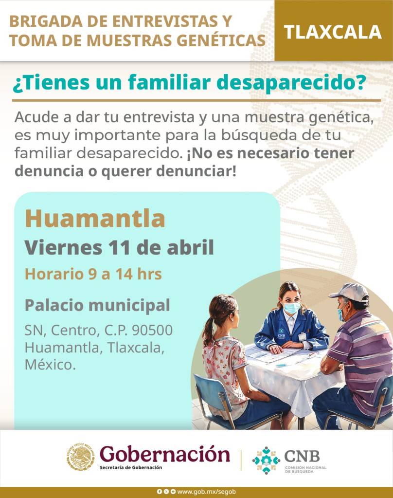 El Gobierno Municipal de Huamantla, en colaboración con la Secretaría de Gobernación y la Comisión Nacional de Búsqueda, hace un llamado a todas las familias que tengan un ser querido desaparecido a participar en la Brigada de Entrevistas y Toma de Muestras Genéticas, que se llevará a cabo el próximo viernes 11 de abril de 2025, en el Palacio Municipal, de 9:00 a 14:00 horas.