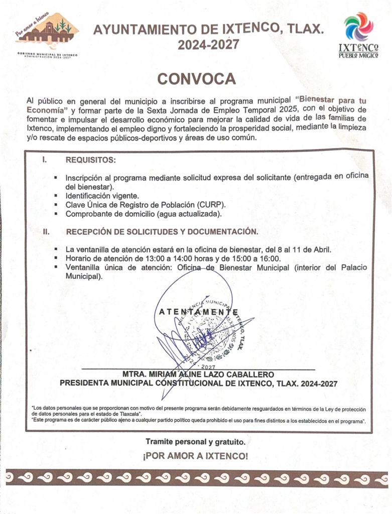 El Gobierno de Ixtenco, encabezado por la presidenta municipal Aline Lazo Caballero, convoca a la ciudadanía a inscribirse en la Sexta Jornada de Empleo Temporal 2025, a través del programa municipal “Bienestar para tu Economía”, cuyo propósito es fomentar el desarrollo económico de las familias del municipio mediante la generación de empleo digno y el fortalecimiento del tejido social.
