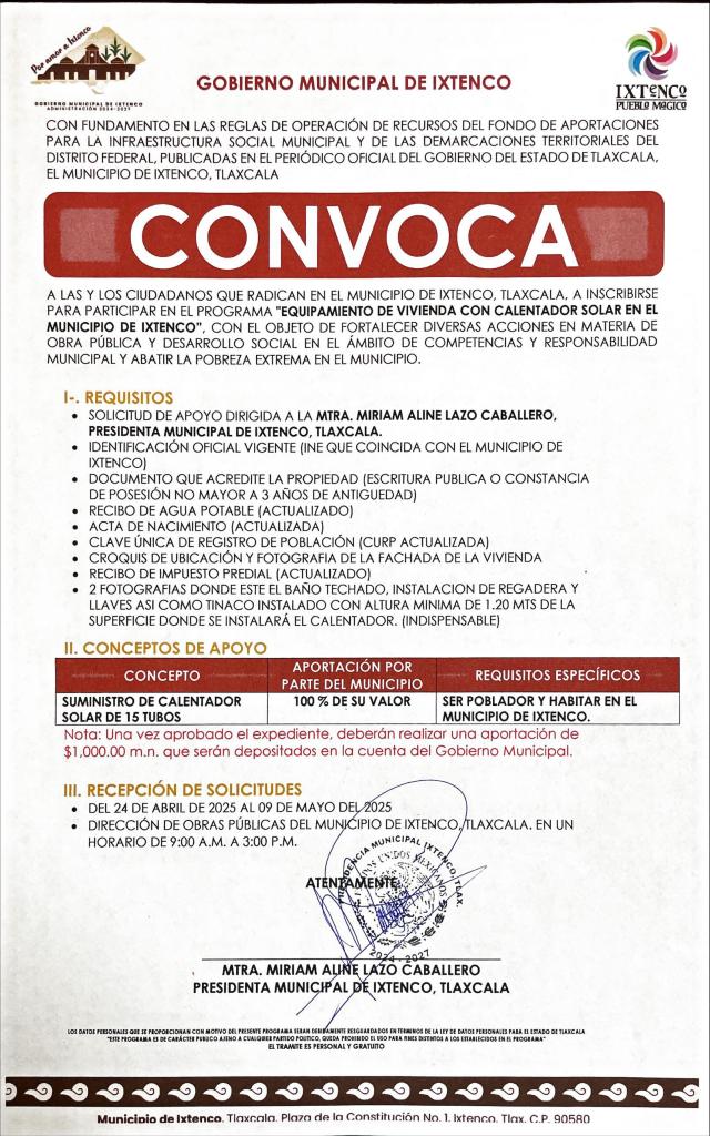 Ixtenco, Tlaxcala, abril de 2025.- Con el objetivo de mejorar las condiciones de vida de las familias en situación vulnerable y contribuir al abatimiento de la pobreza extrema, el Gobierno Municipal de Ixtenco, encabezado por Aline Lazo Caballero, emitió la convocatoria al programa “Equipamiento de Vivienda con Calentador Solar en el Municipio de Ixtenco”.