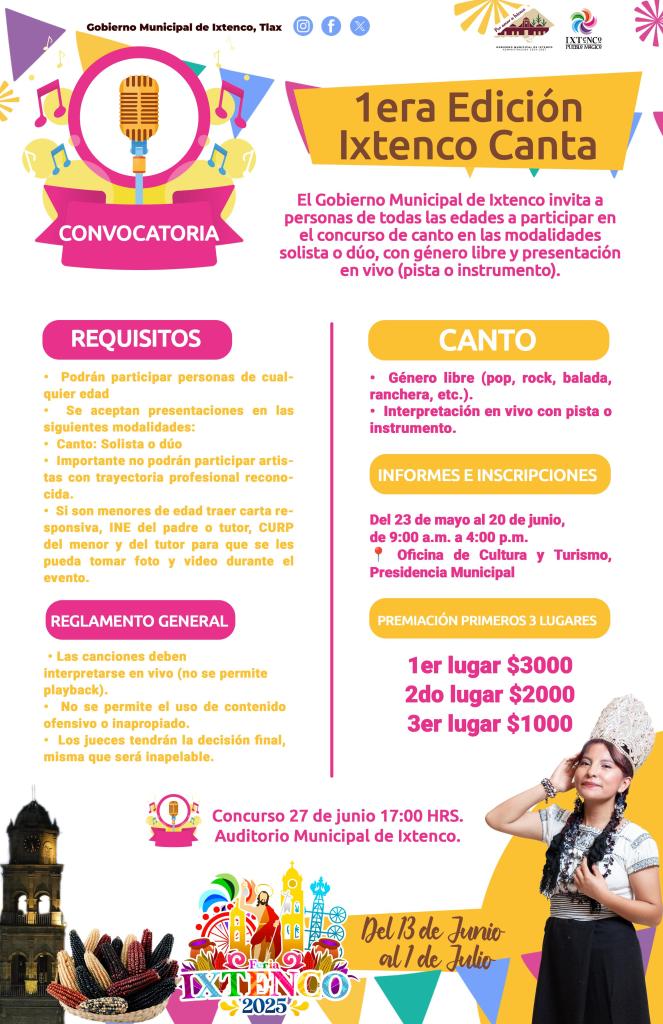 Como parte de las actividades artísticas y culturales de la Feria Ixtenco 2025, en honor a San Juan Bautista, el Gobierno Municipal de Ixtenco, encabezado por la presidenta Aline Lazo Caballero, lanzó oficialmente la convocatoria para “Ixtenco Canta”, un concurso de canto dirigido a personas de todas las edades que deseen mostrar su talento vocal.