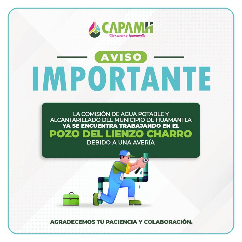 La Comisión de Agua Potable y Alcantarillado del Municipio de Huamantla (CAPAMH) informa a la ciudadanía que el pozo del Lienzo Charro ha presentado una avería inesperada. El personal de CAPAMH ya se encuentra trabajando para restablecer su operación en el menor tiempo posible.