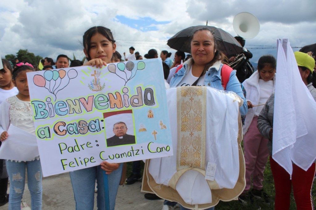 De a poco a la gente estaba reunida había una de las cartulinas que resaltaba “Bienvenido Padre Felipe Cuamatzi Hoy la comunidad de Ignacio Zaragoza abre sus puertas y su corazón para recibirlo con fe, esperanza y gratitud” Bienvenido a su nueva casa Espiritual, un buen número de niñas y niños reunidos con pancartas con mensajes de bienvenida.