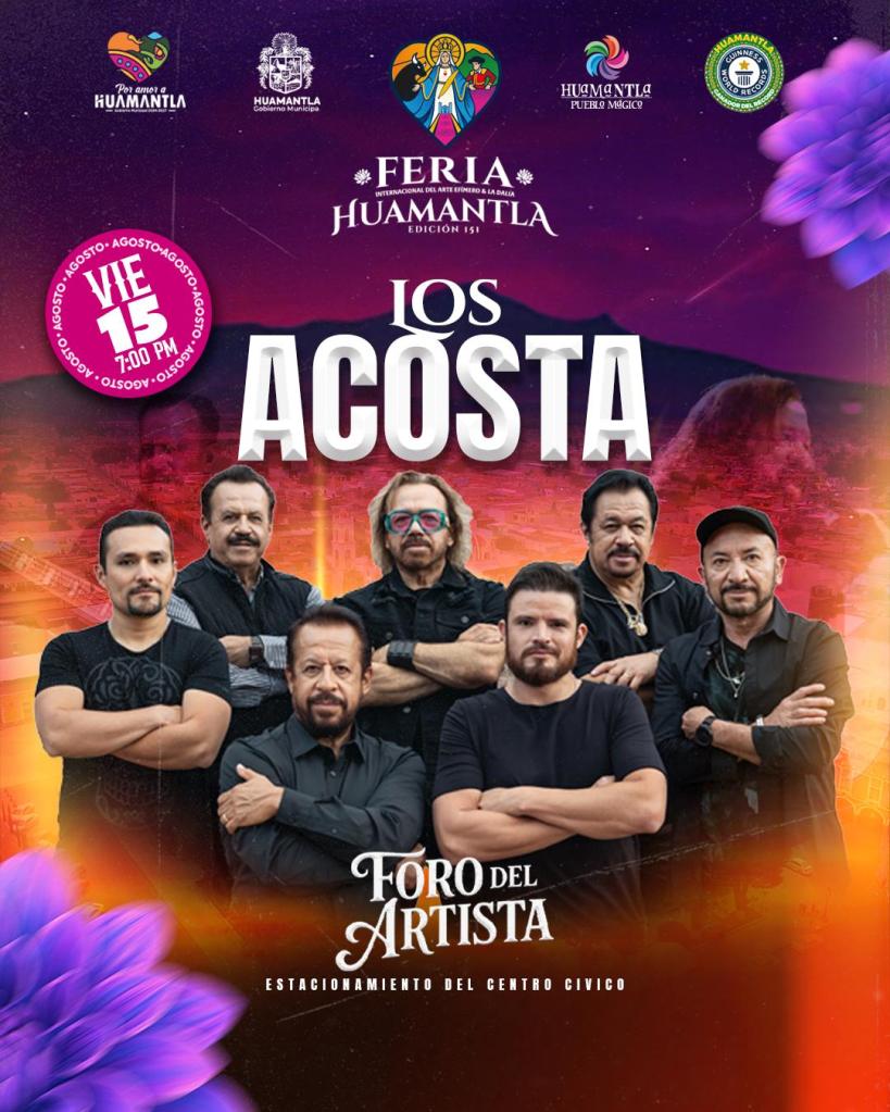 El Gobierno Municipal de Huamantla, que encabeza Salvador Santos Cedillo, continúa difundiendo los grandes espectáculos que formarán parte de la Feria Internacional del Arte Efímero y la Dalia 2025, y confirma la presentación del legendario grupo Los Acosta.