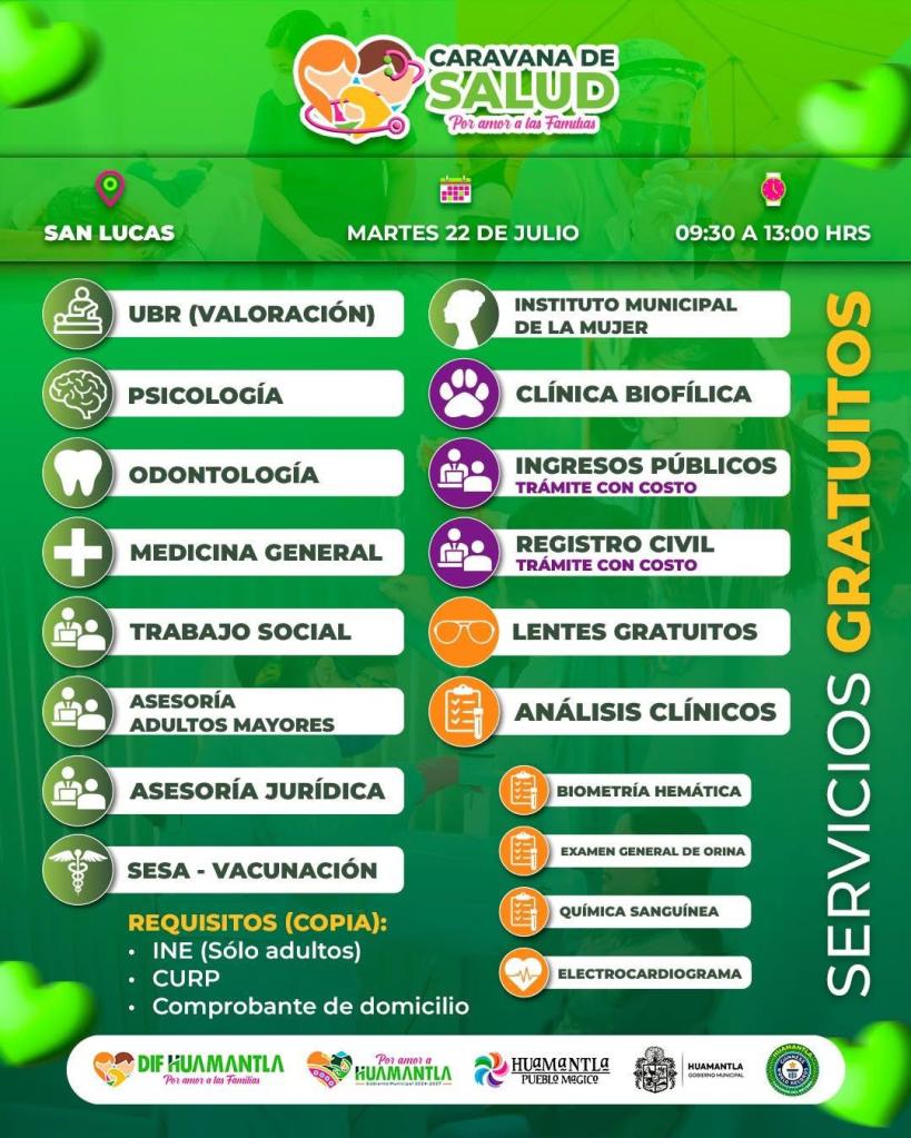 El Ayuntamiento de Huamantla y el Sistema Municipal para el Desarrollo Integral de la Familia (SMDIF), invitan a la población a participar en la próxima jornada de la Caravana de la Salud, que se llevará a cabo mañana martes 22 de julio en la comunidad de San Lucas, en un horario de 09:30 a 13:00 horas.