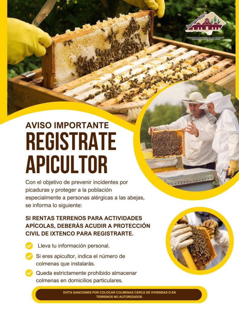 Con el objetivo de prevenir incidentes por picaduras y salvaguardar la integridad de la población —especialmente de personas alérgicas a las abejas—, el Gobierno Municipal de Ixtenco, que preside Aline Lazo Caballero, a través de la Coordinación de Protección Civil encabezada por César Omar Ordoñes Moreno, hace un llamado a todos los apicultores que renten terrenos para la instalación de colmenas.