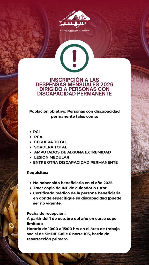 El H. Ayuntamiento de Ixtenco, encabezado por la presidenta municipal Aline Lazo Caballero, en coordinación con el Sistema Municipal para el Desarrollo Integral de la Familia (SMDIF), que preside de manera honorífica Alicia Caballero Yonca y dirige Raúl Hernández Gaspar, anunció la apertura del Programa de Despensa Mensual 2026, el cual está dirigido a personas con discapacidad permanente.