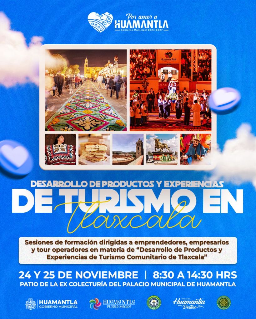Las sesiones se realizarán los días 24 y 25 de noviembre, en un horario de 08:30 a 14:30 horas, en el patio de la Ex Colecturía del Palacio Municipal de Huamantla. Durante las jornadas se abordarán metodologías y buenas prácticas para el diseño de productos turísticos innovadores, sostenibles y vinculados al territorio.