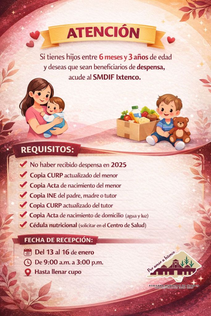 El Sistema Municipal para el Desarrollo Integral de la Familia (SMDIF) Ixtenco anunció el inicio del periodo de recepción de documentos para que niñas y niños de 6 meses a 3 años de edad puedan ser beneficiarios del programa de apoyo de despensa, dirigido a fortalecer la nutrición y bienestar de la primera infancia en el municipio.