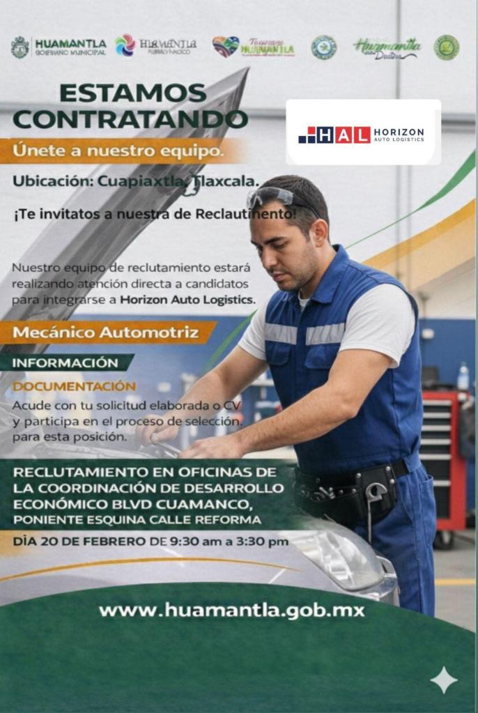 Con el objetivo de seguir abriendo puertas al desarrollo profesional de las y los huamantlecos, el Gobierno Municipal de Huamantla, a través de la Coordinación de Desarrollo Económico, invita a la Jornada de Reclutamiento que realizará la empresa Horizon Auto Logistics (HAL) para integrar nuevo talento a su equipo de trabajo.