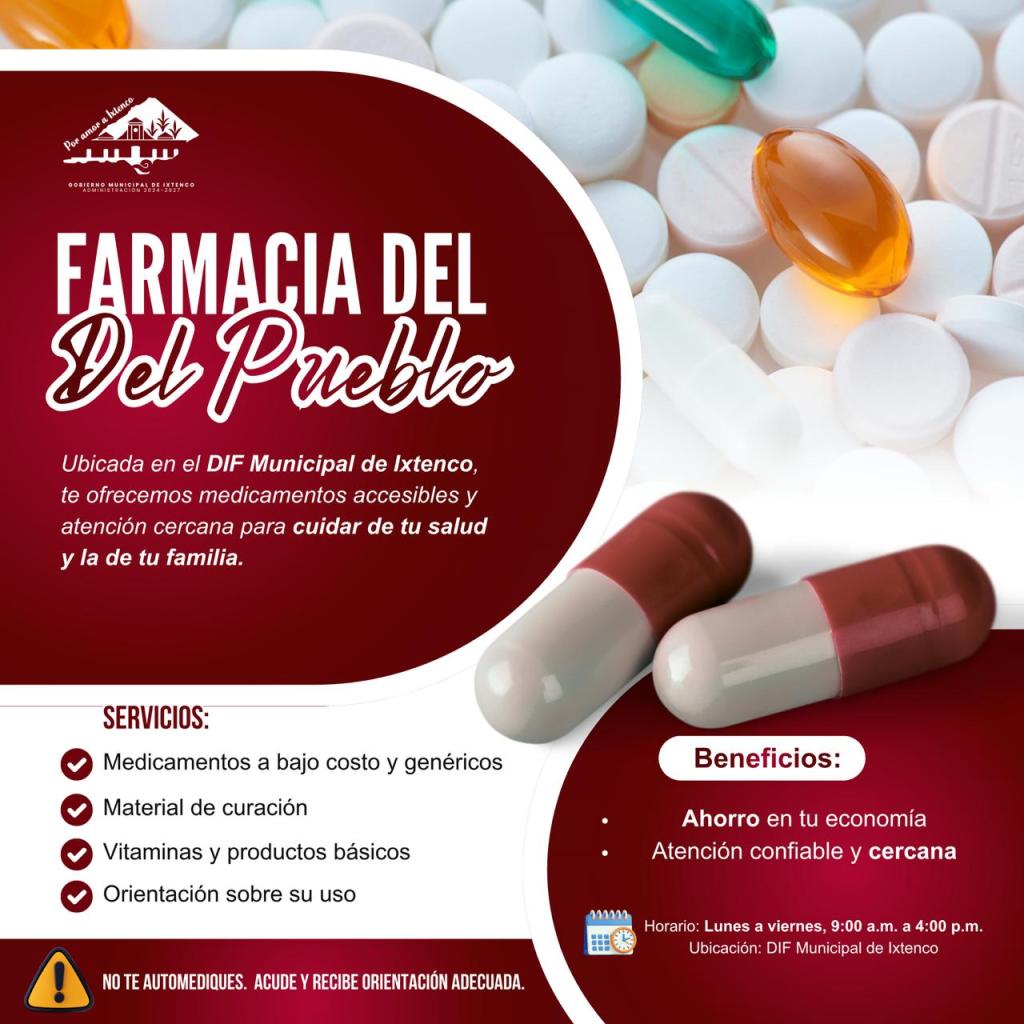 La Farmacia del Pueblo atiende de lunes a viernes en un horario de 9:00 a.m. a 4:00 p.m. en las instalaciones del DIF Municipal de Ixtenco.